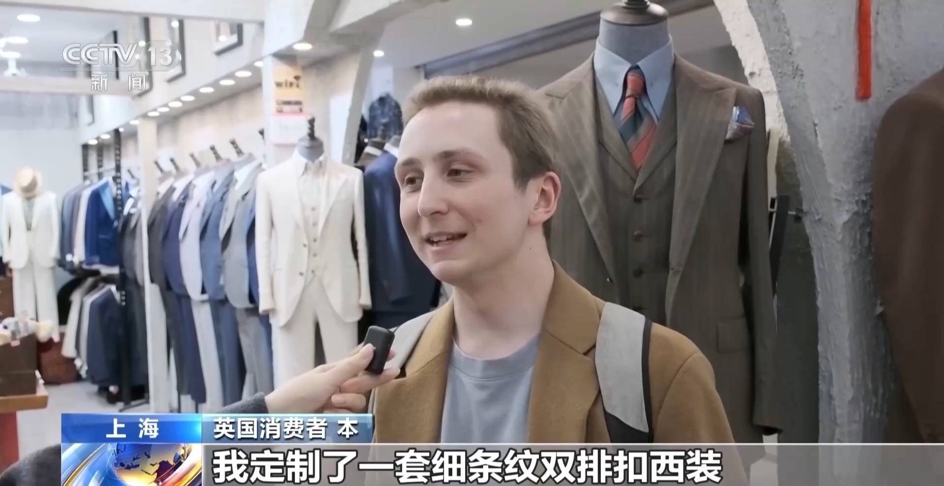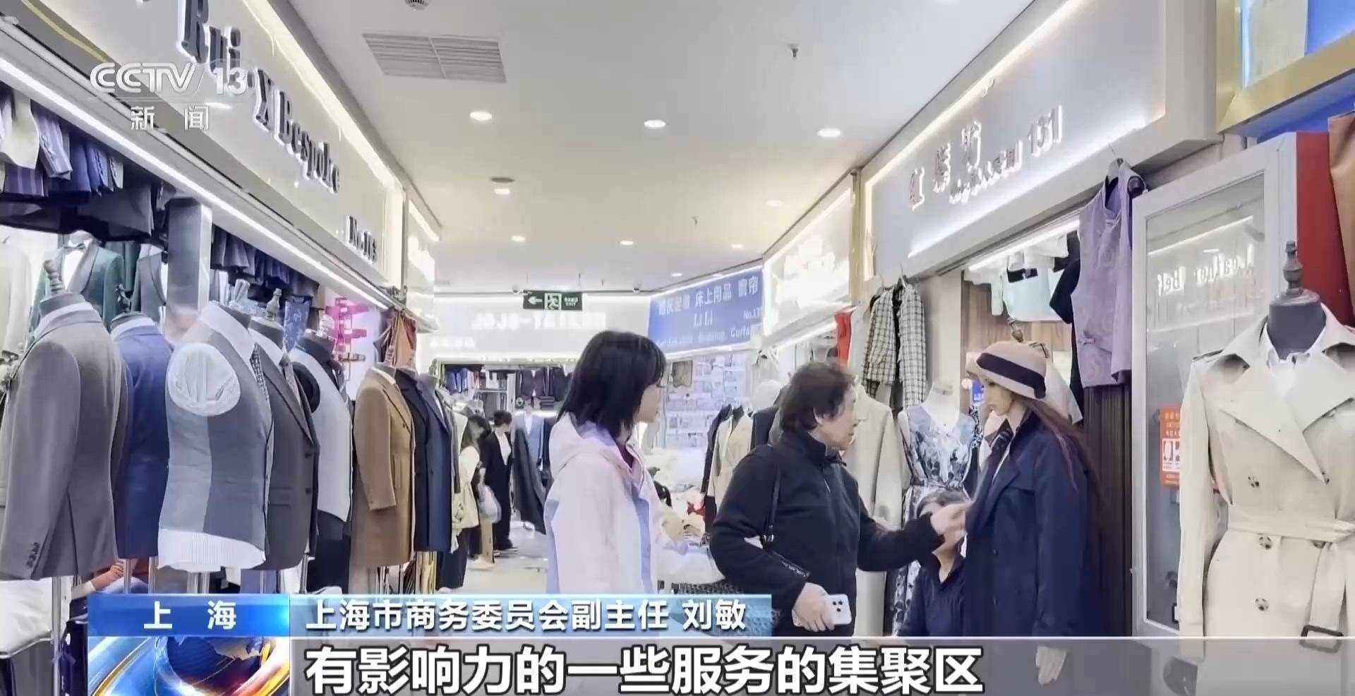 总台记者 曲涵:这里是临近外滩与豫园商圈的南外滩轻纺面料市场。一共有1万多平方米,有280家店铺。从旗袍、西装、礼服到日常的穿搭,这里以定制消费为主,部分的商铺也会售卖成衣,种类非常齐全。几乎每一家店铺门口都挂着醒目的英文招牌,整个市场已经形成了比较成熟的国际化服务业态。
