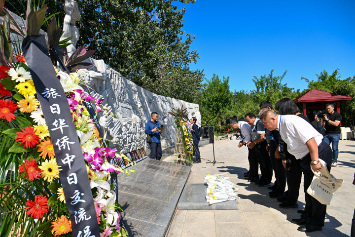 9月18日,中日友好人士在天津“花冈暴动纪念园”献花鞠躬。新华社记者 孙凡越 摄
