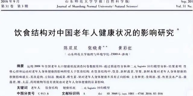 陈双双.饮食结构对中国老年人健康状况的影响研究, 山东师范大学学报(自然科学版), 2016-09-15